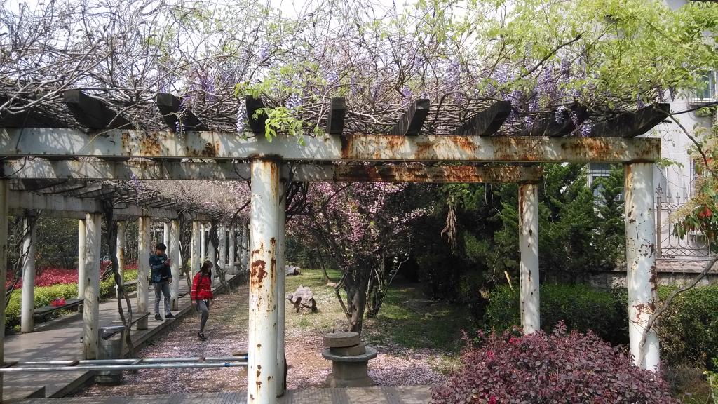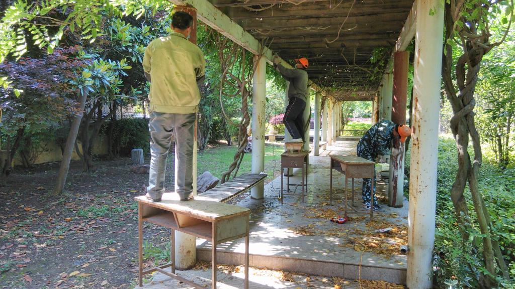 学院园林长廊是广大师生学习、休闲的公共场所,由于年久失修,锈蚀严重,影响校园美观,并存在安全隐患。学院领导安排后勤集团优化修缮方案,选择了质优、价低的自行施工方案。